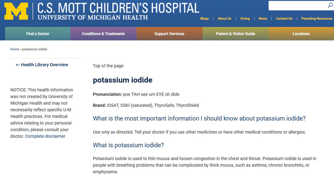 Michigan Medicine, 2013. Potassium Iodide | CS Mott Children's Hospital | Michigan Medicine. [online] Mottchildren.org.