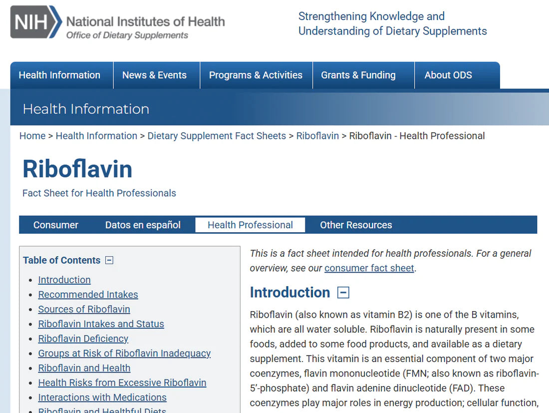 National Institutes of Health, Office of Dietary Supplements. (2022). Riboflavin - Health Professional Fact Sheet.https://ods.od.nih.gov/factsheets/Riboflavin-HealthProfessional/